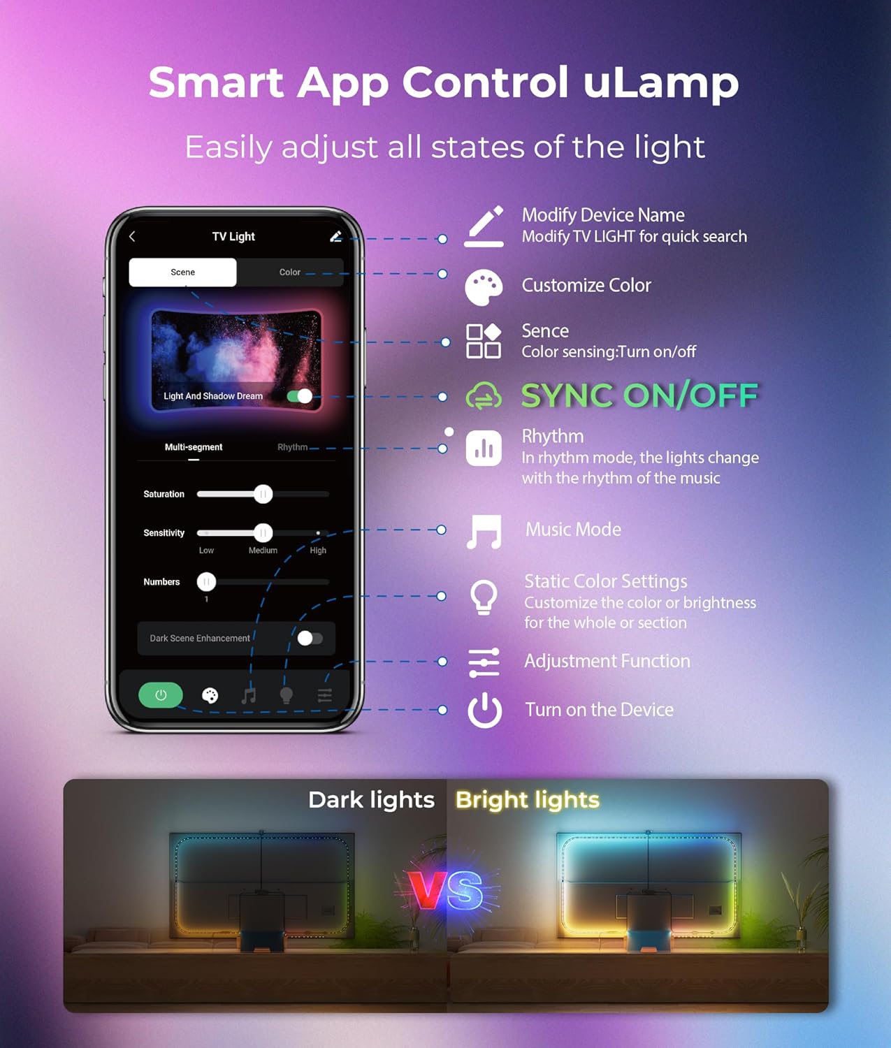 - Smart Control & Scene - You can easily control the TV backlight through the controller/APP control. The DIY mode of the APP allows you to adjust the color and effect according to your mood. It also provides a rich scene and music rhythm. It is suitable for game room lights or room lighting, and can also be used as a festive atmosphere decoration.